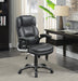 Perfect for a home office, this office chair features plush seating and headrest for working long hours.Wrapped in a supple leatherette, this chair also offers ergonomic design with curved, padded armrests.Get around the office easily with five chrome caster wheels.Included with this office chair is an adjustable lever to raise to your existing desk height.Place this office chair in a modern or contemporary home office for ultimate comfort and support. Includes: One (1) office chair