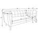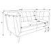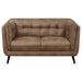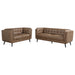 Host guests in your contemporary living room with this mid-century modern shelter style seating set, featuring plush grid tufted backrests and cushions upholstered in a soft brown performance coated microfiber for supreme comfort. This retro-inspired contemporary upholstered living room collection presents classic Chesterfield style frames, accented with wet trim details and flared tapered dark brown wood legs for a chic vintage vibe.