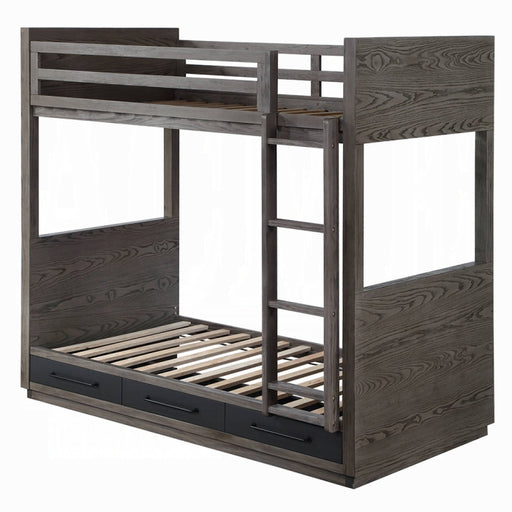 FOA EastCalifornia IV Gray Twin/Twin Bunk Bed, 78 3/8"L X 41 5/8"W X 65"H 1/2"H, 152.24lbs. This twin over full bunk bed includes two large drawers for sto...