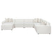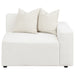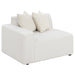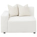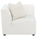 Bridge two modular sectional pieces together effortlessly with this modern corner chair, designed in an easy-to-maintain bright pearl performance upholstery across its foam padded pocket coil seat and a low-profile backrest. Bold black round legs offer a touch of contrast as they peek out from the bottom edge of this modular corner chair.