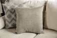 To say that this sofa set is immaculate is an understatement. The neutral tones and simple silhouette lends to the focus of the piecethe warm ivory chenille that wrap the set. With padded cushions on the inside, the track arms provide support, while the oversize back pillows are loose and comfortable. To top it off, pillows in solid and graphic light gray are included for a classic contemporary look.