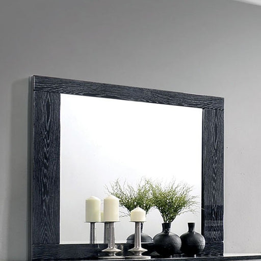 FOA EastThis mirror brings a modern feel with a streamlined design highlighted by a wood grain that pops against its dark finish.
