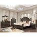 This ample bed set is a grand and elegant statement for any bedroom. The headboard's camelback design crests at a seashell styled motif emblazoned at its crown. Vertical planks and post legs add to an even greater sense of scale. The case goods feature carved post corners, delicate molded trims, and amenities like USB chargers in the nightstand and a hidden drawer in the dresser to ensure your most prized items have a safe place to tuck away. Lay your head down and rest in your newly transformed bedroom.
