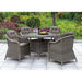 This contemporary patio chairs features comfortable seats with fabric cushions that can be arranged around the tempered glass and umbrella-ready table for an inviting outdoor brunch! With the sun shining overhead and a gentle breeze making the day perfect, this is one chair you will never regret adding to your home.