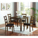 Traditional curved wood ladder-back chairs accompany this classic table, all finished in a rich walnut to darken and enchance their matching wood grain patterns. The cozy square table top makes efficient use of limited space. A practical gem!