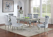 Dining in style is easy with this fabulous gray dining set. The table features intricate mirror designs on the apron and legs, brightening the room with soft, natural light reflections. Padded flannelette chairs add comfort to the chic design with their tufted wingbacks, nailhead trim, and soft gray tones. Glamorous and opulent, this ensemble provided comfortable seating with an expandable leaf that offers plenty of space for friends and family alike.