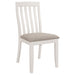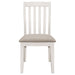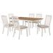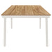 Host the family or entertain friends with the welcoming, casual ambiance of a five-piece modern farmhouse dining set. It centers on a rectangular dining table that seats six comfortably, perfect for family gatherings and daily meals. A natural acacia wood finish graces the tabletop, adding warmth to a cool white base and side chairs. Light brown upholstery is a perfect complement, adding neutral appeal. The table catches the eye with an angular base design complete with a tapered apron and splayed legs that add understated dimension, and chairs offer vertical slatted backs for a light, airy finishing touch.