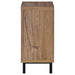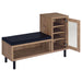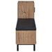 Elevate your entryway with this multifunctional shoe storage bench, elegantly merging form and function. Its engineered wood frame is finished with a durable natural oak colored wood-look laminate veneer, while a black faux leather cushion, foam-padded for comfort, tops the seating area. On one side, a cane-style metal panel door opens to reveal four tiers of shelving, neatly organizing your footwear. Supported by black powder-coated metal legs, this versatile piece delivers both style and practicality in one refined package.