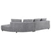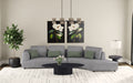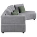 Center your sophisticated living space with a boldly curved modern sectional sofa. It's a dramatic choice with a wide arm on one side and an open curve on the opposite side. Soft grey upholstery sets a neutral tone, while forest green accent pillows bring a touch of contrast. The earthy green ties into surrounding decor to create a hint of organic flair. Compact feet add a bit of height, great for an airy presentation.